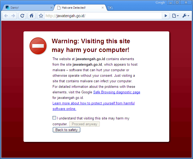 Google mendeteksi salah satu halaman dari situs jawatengah.go.id sebagai situs yang berbahaya. Kenapa bisa? Bisa jadi halaman tersebut mengandung script yang bisa mengakses data-data pribadi di komputer Anda. Kenapa bisa? Bisa jadi administrator situs yang kurang telaten menjaga keamanan situsnya sehingga bisa diinjeksi dengan sesuatu oleh orang lain yang tidak berkepentingan.